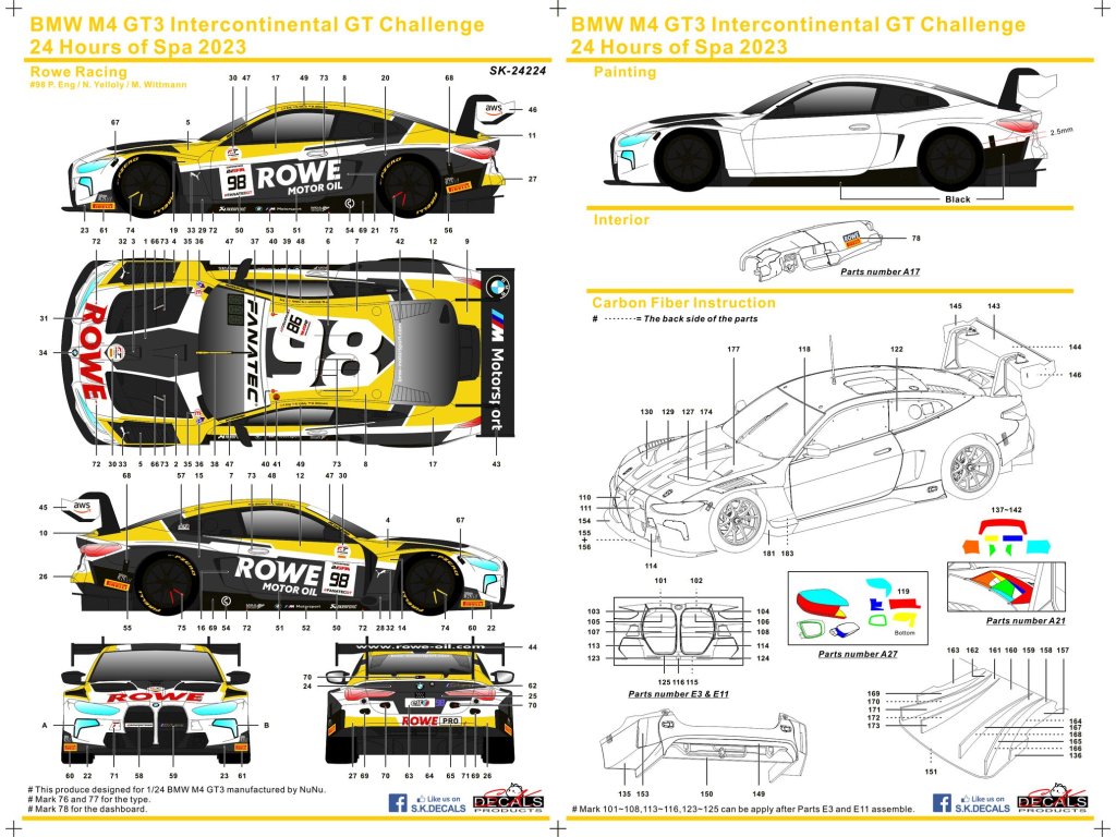 Obtlačok SKDECALS SK24224 - BMW M4 GT3 Intercontinental GT Challenge 24 Hours of Spa 2023 Rowe Racing Nr 98 (1:24)