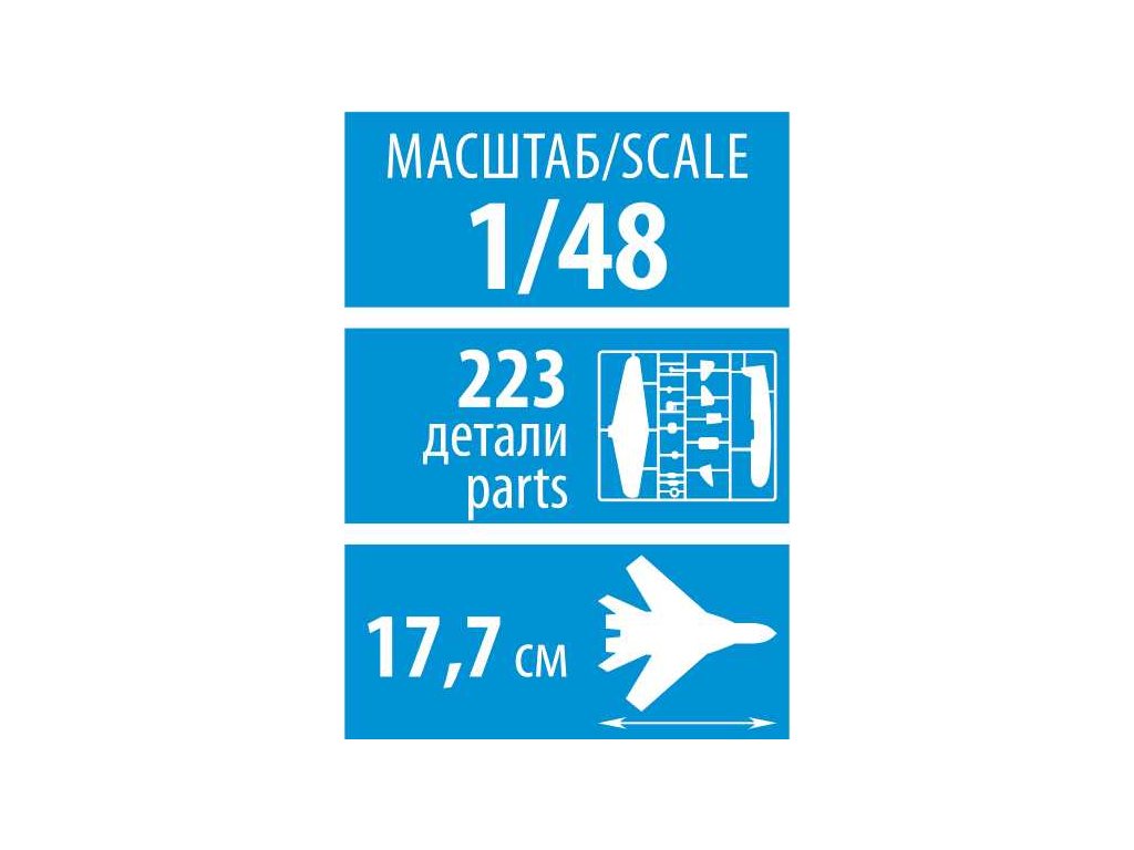 Model lietadla na zlepenie. Veľkosť: 1:48; 17,7 cm. Balenie obsahuje: 223 dielikov na zlepenie.